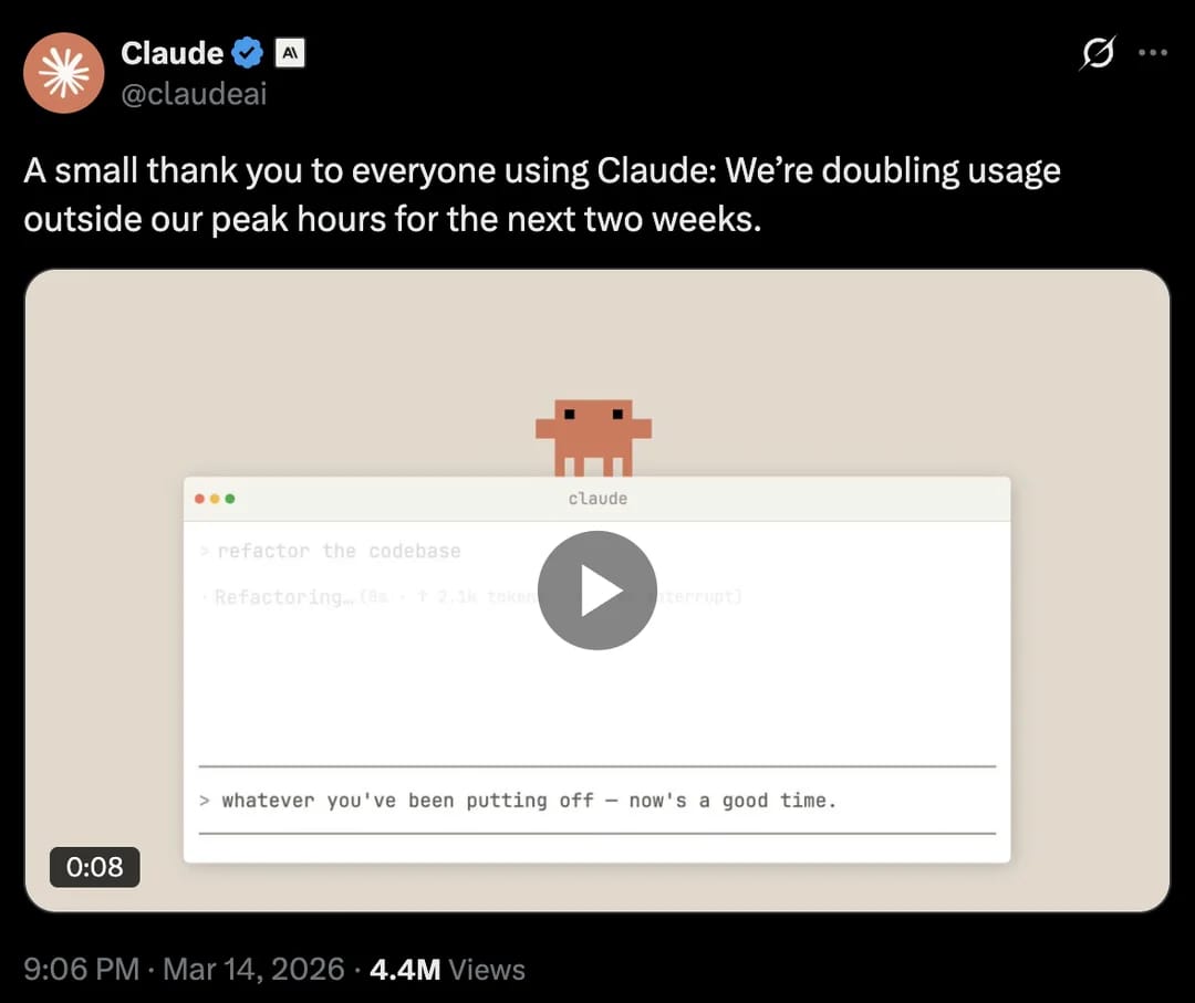 Here's the deal: Anthropic is running a limited-time promotion that doubles five-hour usage limits for Claude users outside peak weekday hours. The promotion runs from March 13 through March 27, 2026, and applies automatically with no action required.
