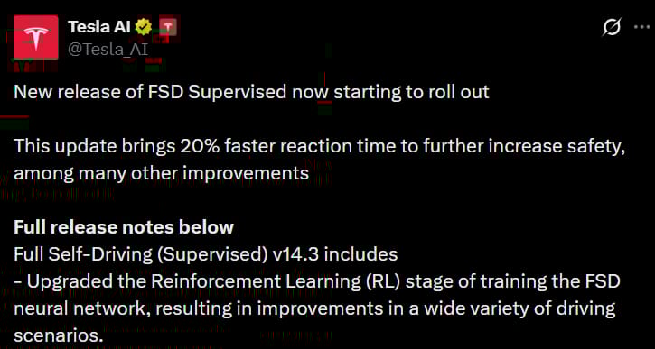 Tesla Rolls Out FSD v14.3 with 20% Faster Reaction Time