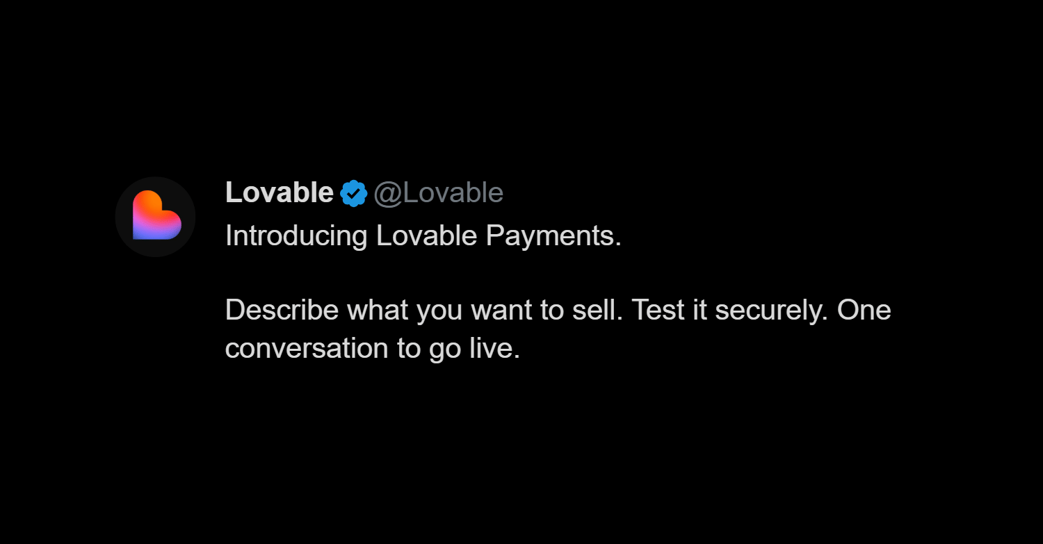 The bigger picture: Building an app with AI takes hours now. Getting paid for it still took weeks of Stripe docs, tax setup, and checkout debugging. That gap is where most solo founders quit. Lovable just removed the last wall between "I built something" and "I'm making money from it." Every vibe-coding platform that doesn't match this will watch its users ship free projects forever and never convert to real businesses.