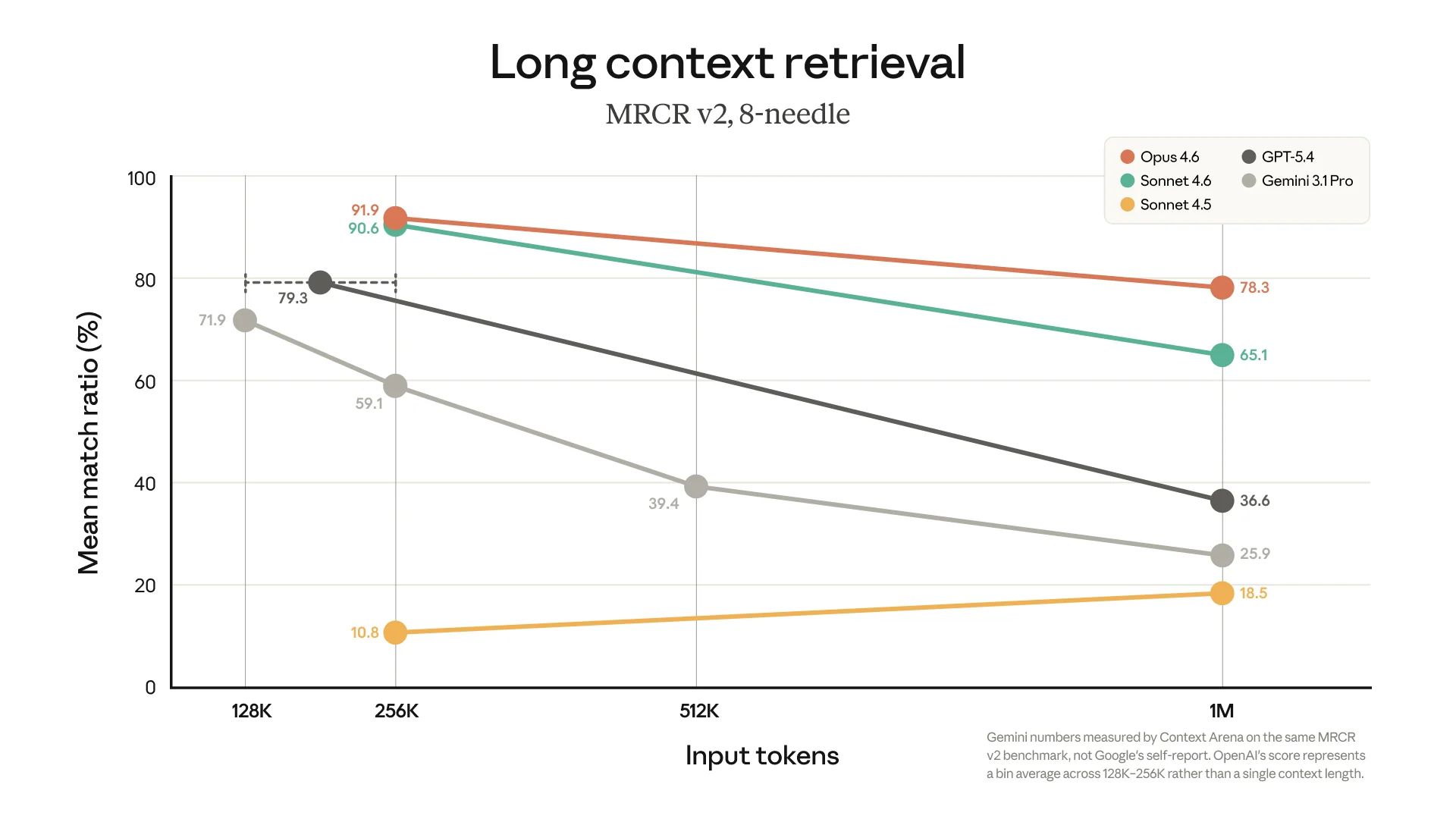 Opus 4.6 scores 78.3% on MRCR v2, the highest among frontier models at that context length.