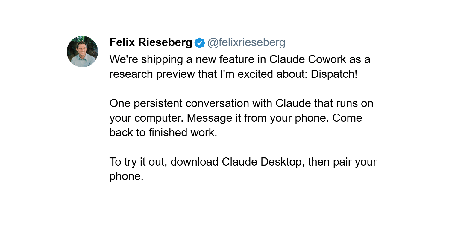 Here's the deal: Anthropic is shipping Dispatch as a research preview inside Claude Cowork. It creates a persistent conversation with Claude that runs on your desktop computer, controllable remotely from your phone.